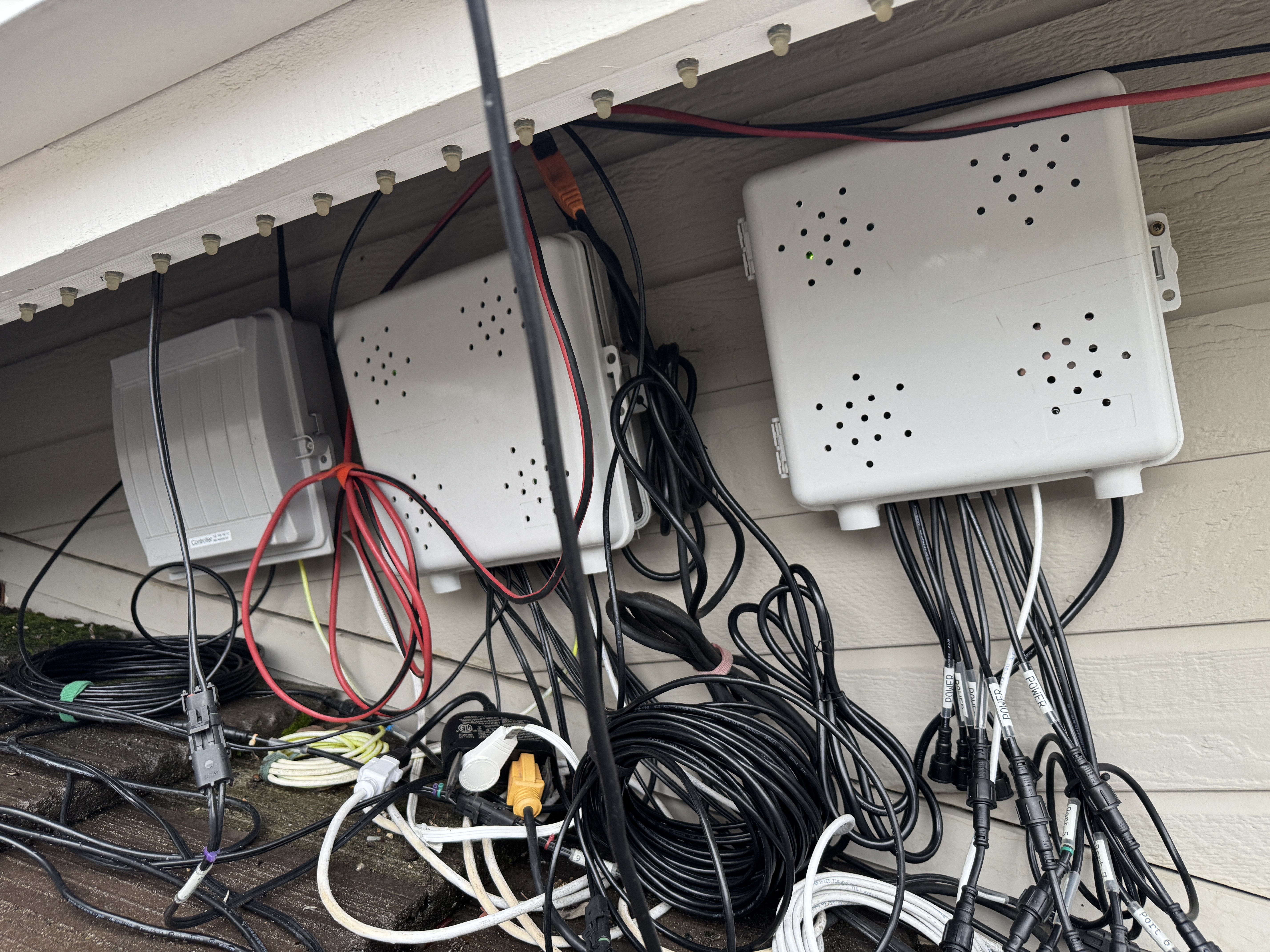 Second, wiring. I would love to find a way to wire things up so I don’t have to run network cables and power halfway across the front of my house under eaves that are 12 feet off the ground. It’s super inconvenient and I have to put it up and take it down every year. This summer I swear I am going to improve this, and that’s different to last year when I said that, and the year before, and…