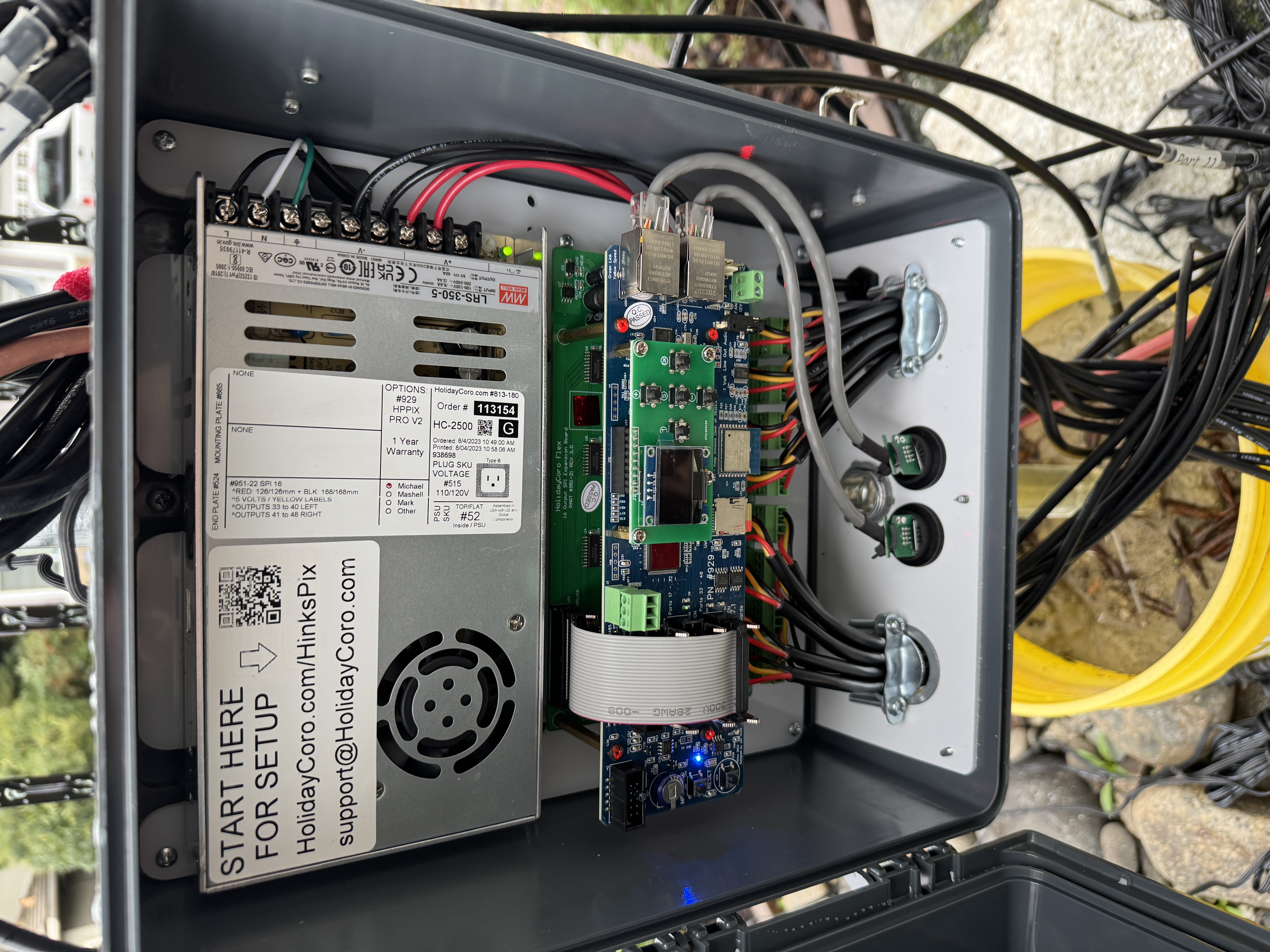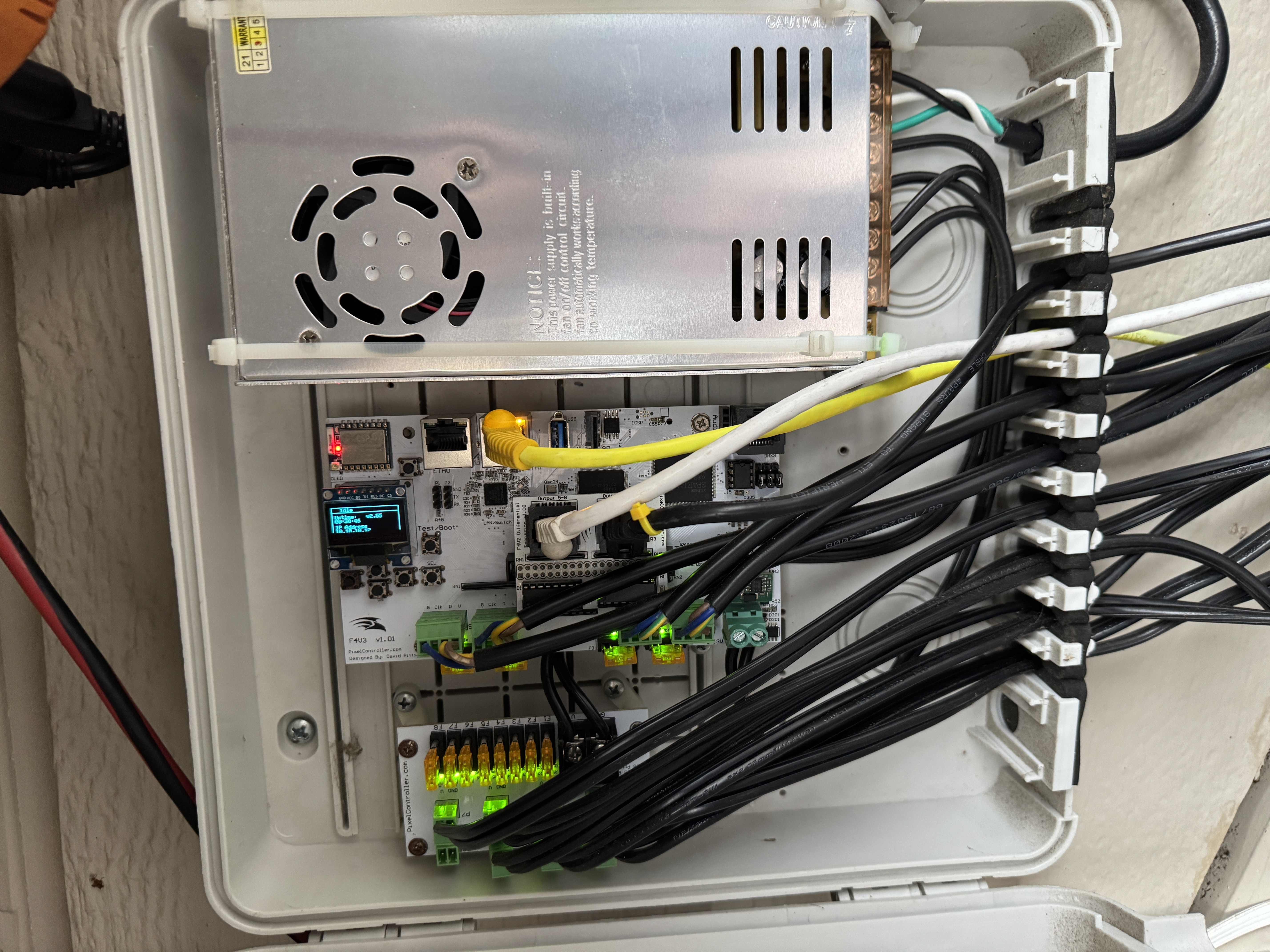 The children of this board are simple receiver boards - called Smart Receivers - in boxes with power supplies in them. They both look identical; one is in the eaves, and the other is on the mega tree pole; both are connected via ethernet.