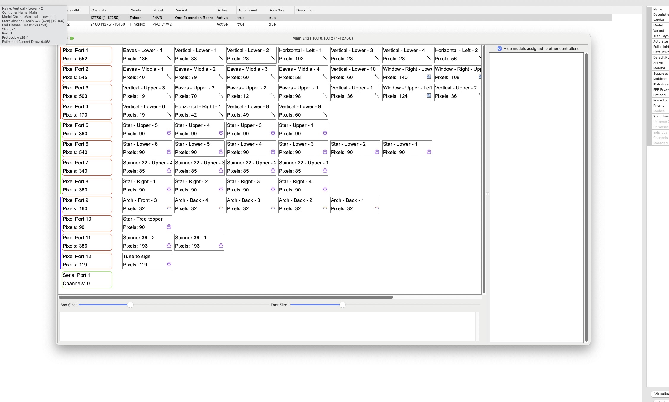 Now, my display has around 5000 pixels, so in order to allow for displays larger than ~670 pixels at a high frame rate, hardware allows for individual ports to be processed in parallel. And this is where the mapping comes in: the mapping portion sets up where the props are in relation to each other; which prop is the first on a particular channel, which comes second, etc. Without this step, xLights would have no idea how to organize the binary data which is rendered and provided to the controllers.
